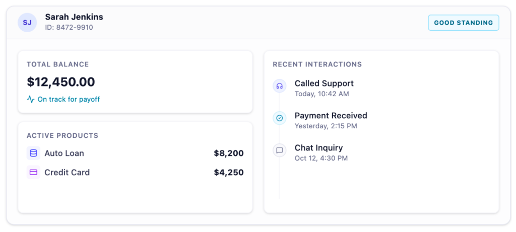 Powering agents with a 360° view of the borrower, bringing together all critical financial and interaction data into one unified interface.